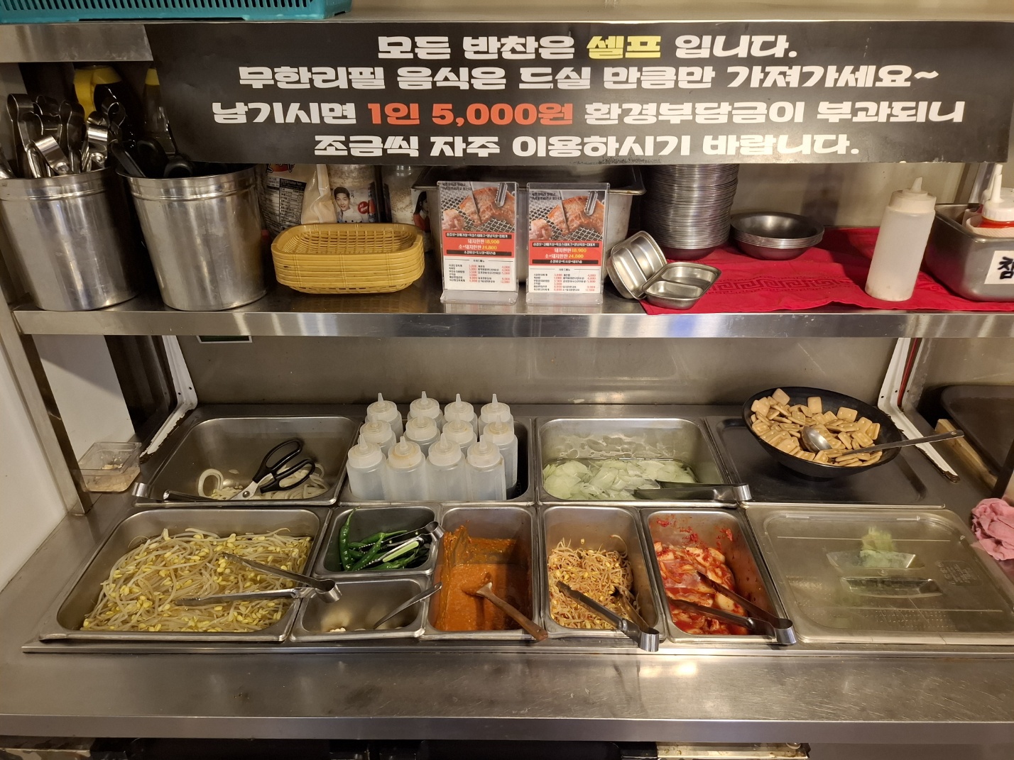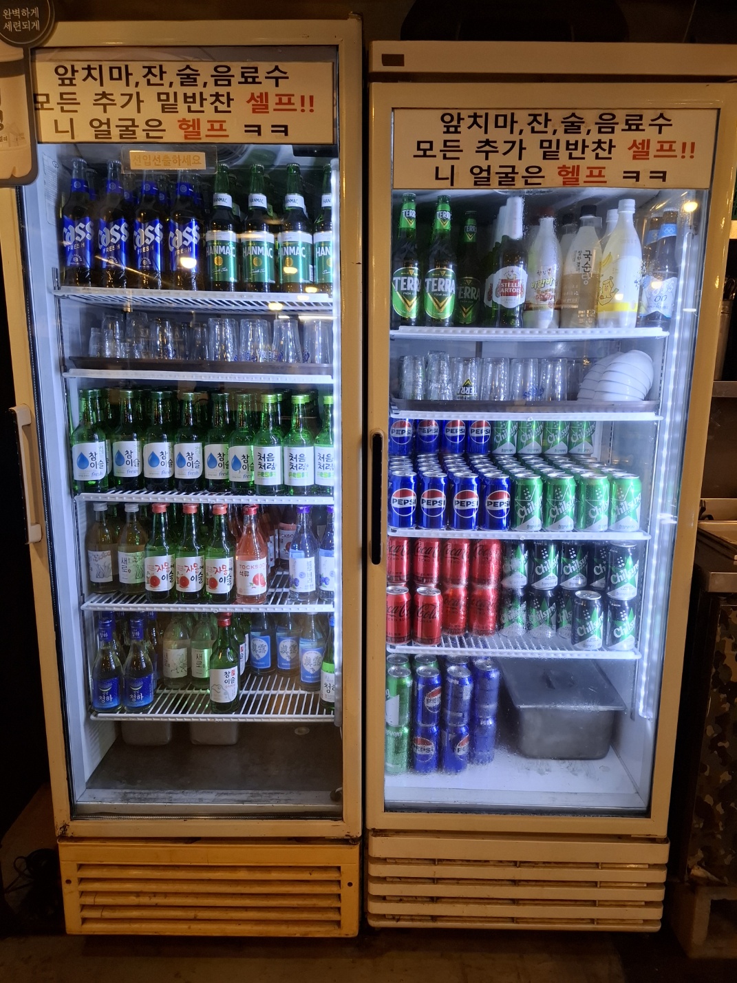 주류와 밑반찬은 셀프예요.